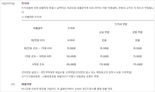 하나은행 주택담보대출 서류는 없습니다. 다만 필요시 추가 제출서류가 있을 수 있습니다. 대출 관련 비용은 근저당권 설정시 국민주택채권 매입비용은 고객 부담(근저당권 말소 또는 채권최고액 감액시 비용 고객부담)이며, 서울보증보험 보험(MCI) 보험료는 은행이 부담합니다. 또한 인지세를 각 50%씩 부담합니다.