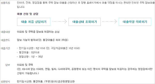 담보는 아파트 및 주택입니다. 다만 KB시세가 없는 아파트, 연립, 빌라, 다세대주택, 공동명의 또는 타인 명의의 주택을 담보로 제공하는 경우에는 영업점에서만 신청이 가능합니다. 하나은행 주택담보대출 상환방법은 만기일시상환, 통장대출, (부분)원(리)금균등분할상환 방식이 적용됩니다.