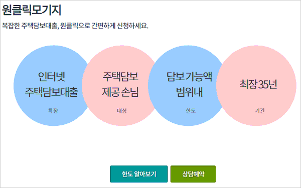 하나은행 홈페이지에서 안내하고 있는 하나은행 주택담보대출 원클릭모기지대출 상품은 영업점 방문 없이 인터넷, 전화, 영업점을 통해 주택 담보 대출을 신청한 후 하나은행 홈페이지에서 대출 약정을 하시는 편리한 인터넷 주택 담보대출 상품입니다.