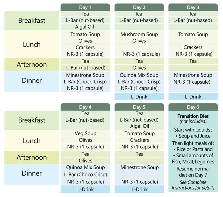 식단 중 한 사례를 보면 1개월 중 5일동안 하루 세끼를 칼로리, 단백질, 당 등의 함량은 적고 대신 불포화지방산 함량이 높은 식사로 대체하는데 이때 5일간 우리 인체는 음식 섭취를 인지하지 못하게 된다고 합니다.