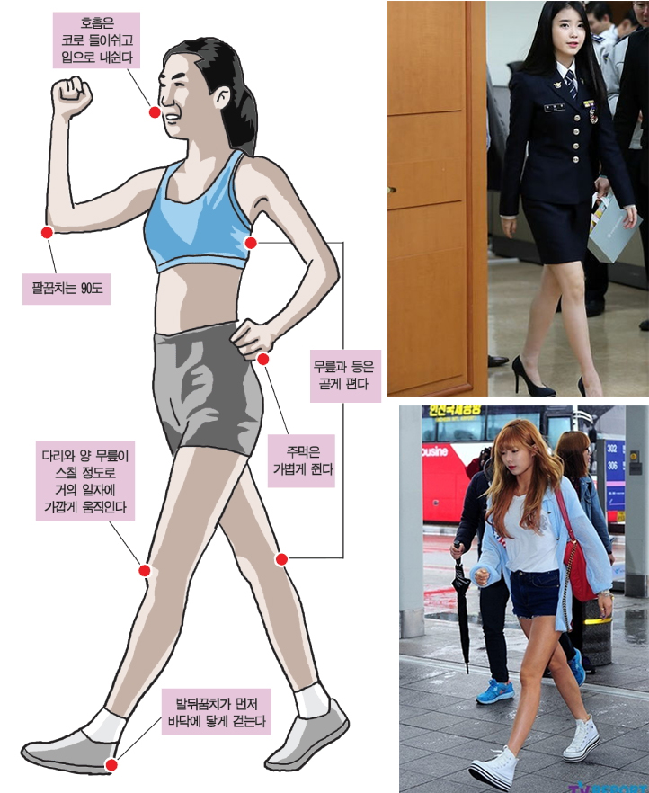 다리가 예쁜 연예인들이 보통 이렇게 걷는 것을 볼 수 있는데요. 뒷무릎을 굽히지 않고 앞발을 힘차게 뻗으면서 앞발은 발뒤꿈치가 먼저 바닥에 닿게 걸으면 된다고 합니다. 어럽지 않기 때문에 쉽게 실천할 수 있는 살빠지는 운동 자세들이죠?