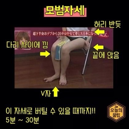 일본에서도 유행한다는 이 자세는 하루에 30분, 5cm 이상의 두꺼운 책을 다리 사이에 끼우면 허벅지 20cm를 줄여주는 효과가 있습니다. 상체를 곧게 세우고 허벅지에 힘주면 얼마 지나지 않아 다리가 부들부들 떨리는 것을 느낄 수 있다고 해요.