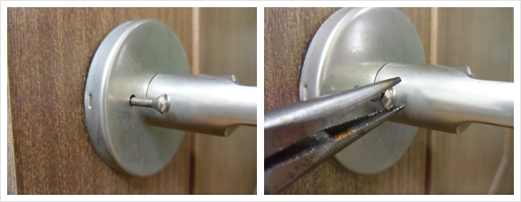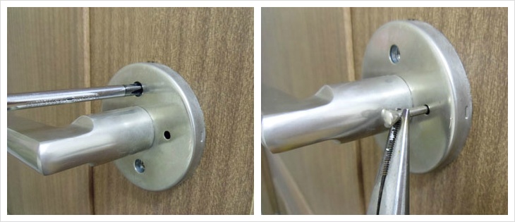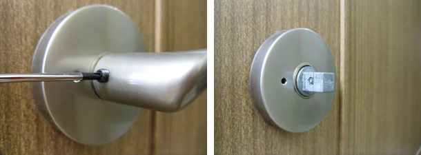 십자 드라이버로 방문 안쪽 손잡이에 있는 나사를 풀어 줍니다.