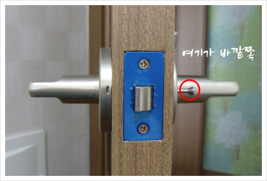 방 바깥쪽에선 나사를 풀 수 없게.. 나사 홈이 없는 손잡이가 바깥쪽으로 가야되겠죠?