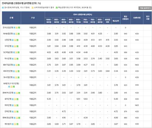 설정한 조건에 따라 모든 은행의 대출 금리 정보가 화면에 나타납니다.