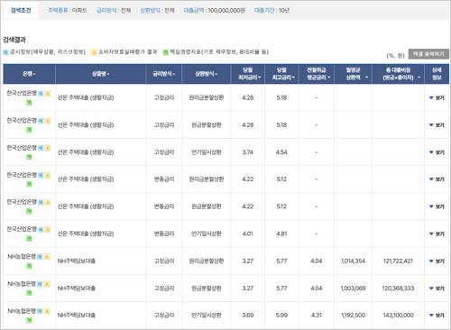 설정한 조건에 따라 모든 은행의 주택담보대출 금리 정보가 화면에 나타납니다.