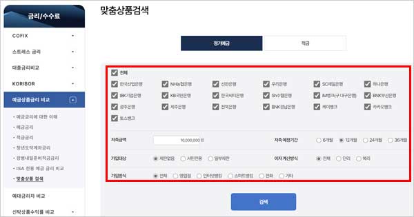 - 금융 권역: 시중은행, 지방은행, 외국계 은행 등 조회하고자 하는 은행의 범위를 선택합니다. (모든 은행을 선택하여 가장 높은 금리를 비교하는 것이 유리합니다.)