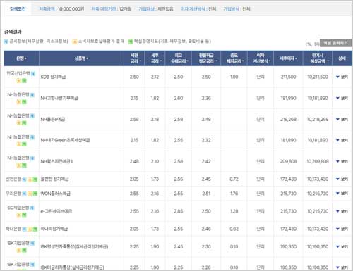 설정한 조건에 따라 모든 은행의 예금 상품 금리 정보가 화면에 나타난다고 해요.
