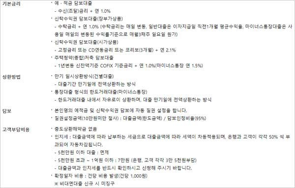 우리은행 청약통장 대출 금리 이자 이율은 1년 변동 신잔액기준 COFIX 기준금리 + 연 1.0%(마이너스통장 연 1.5%)라고 해요.